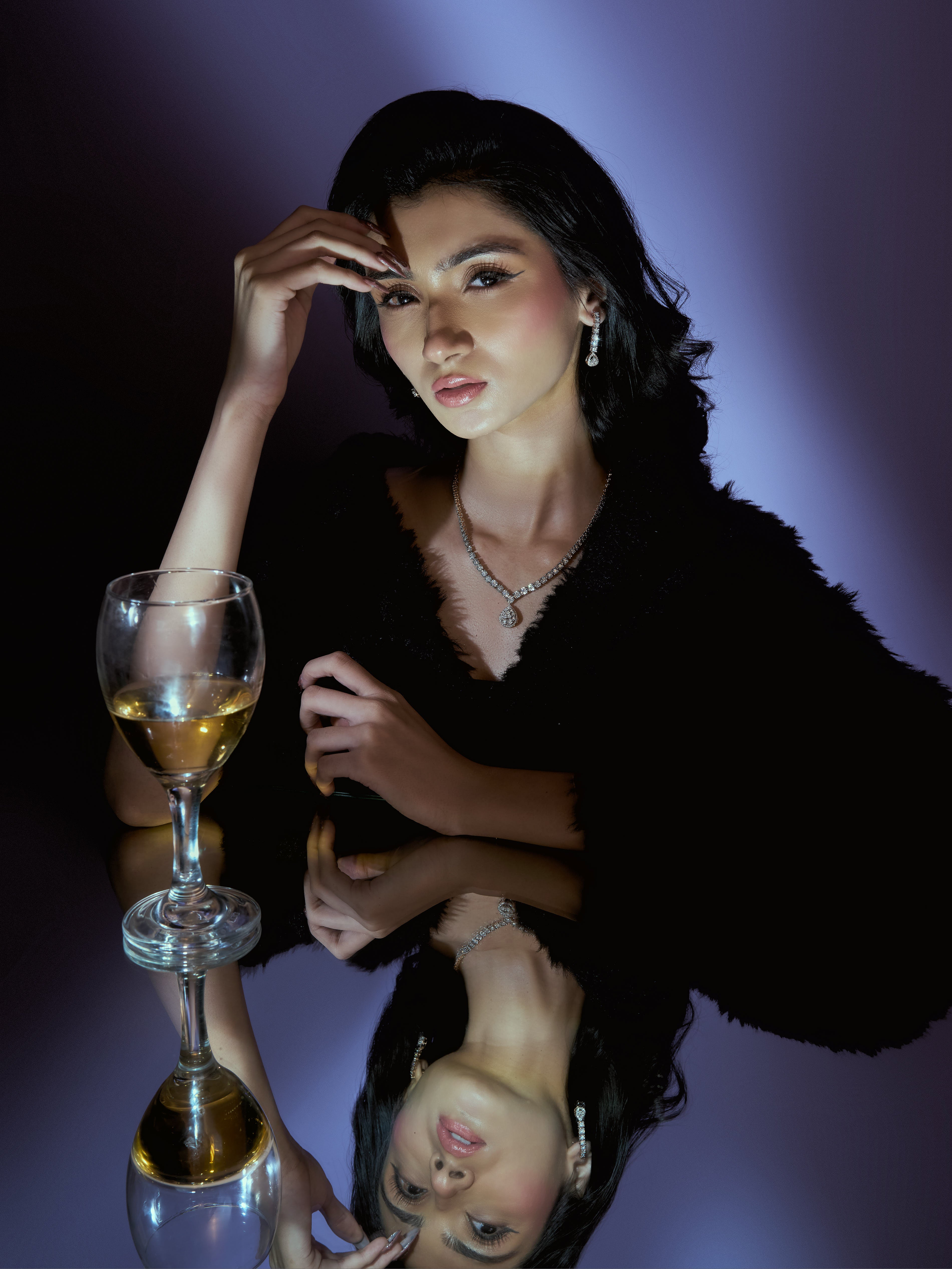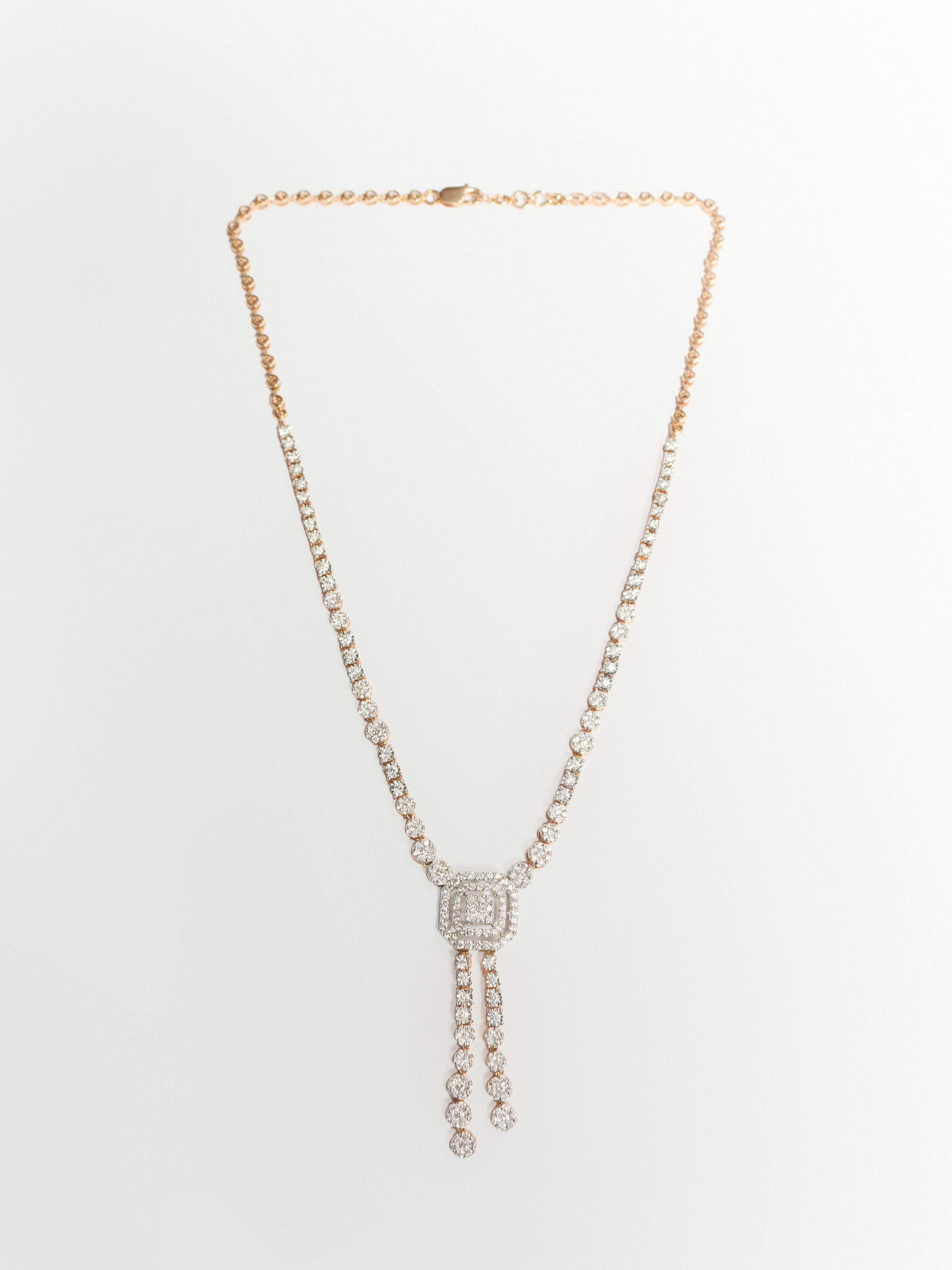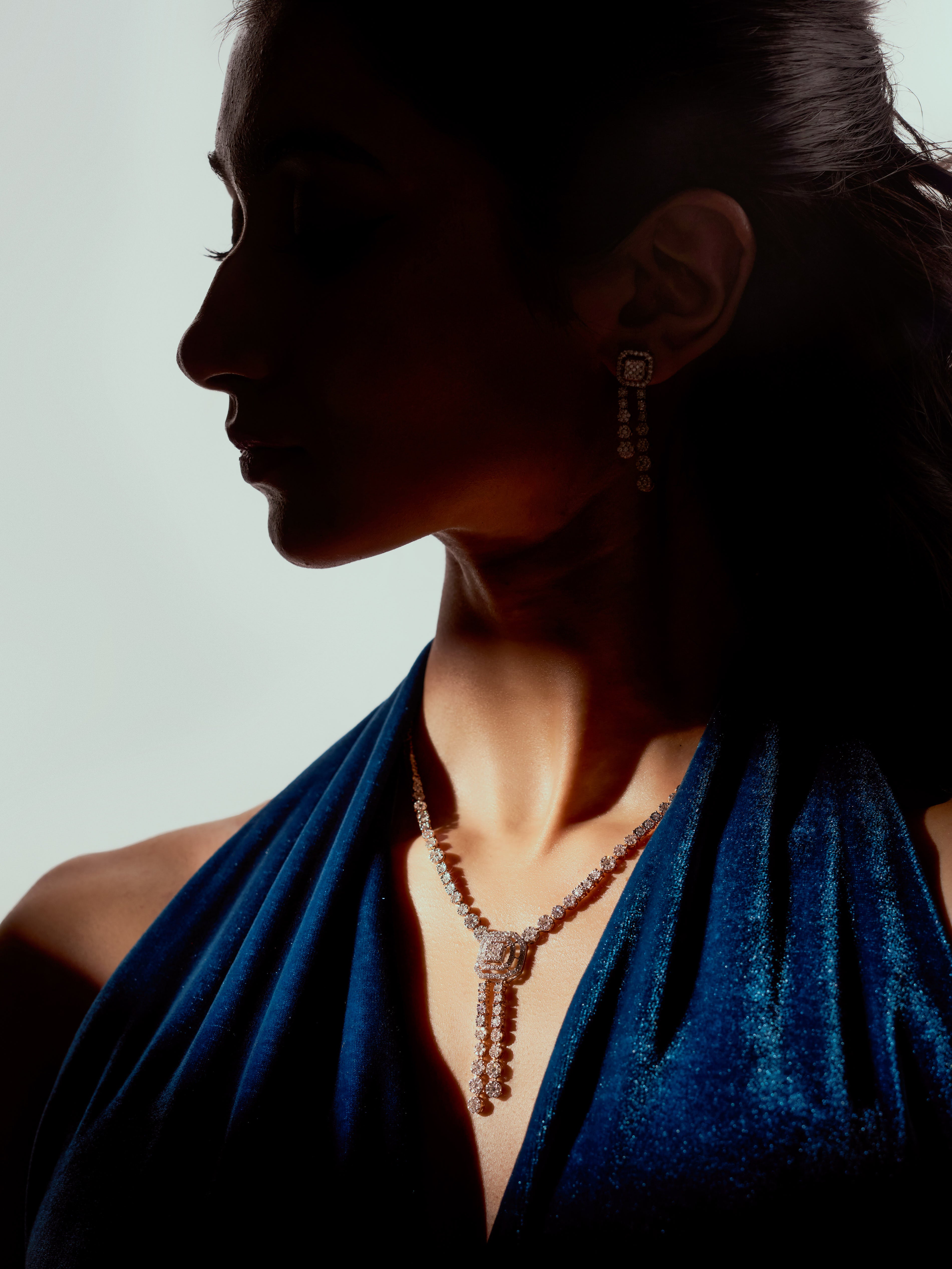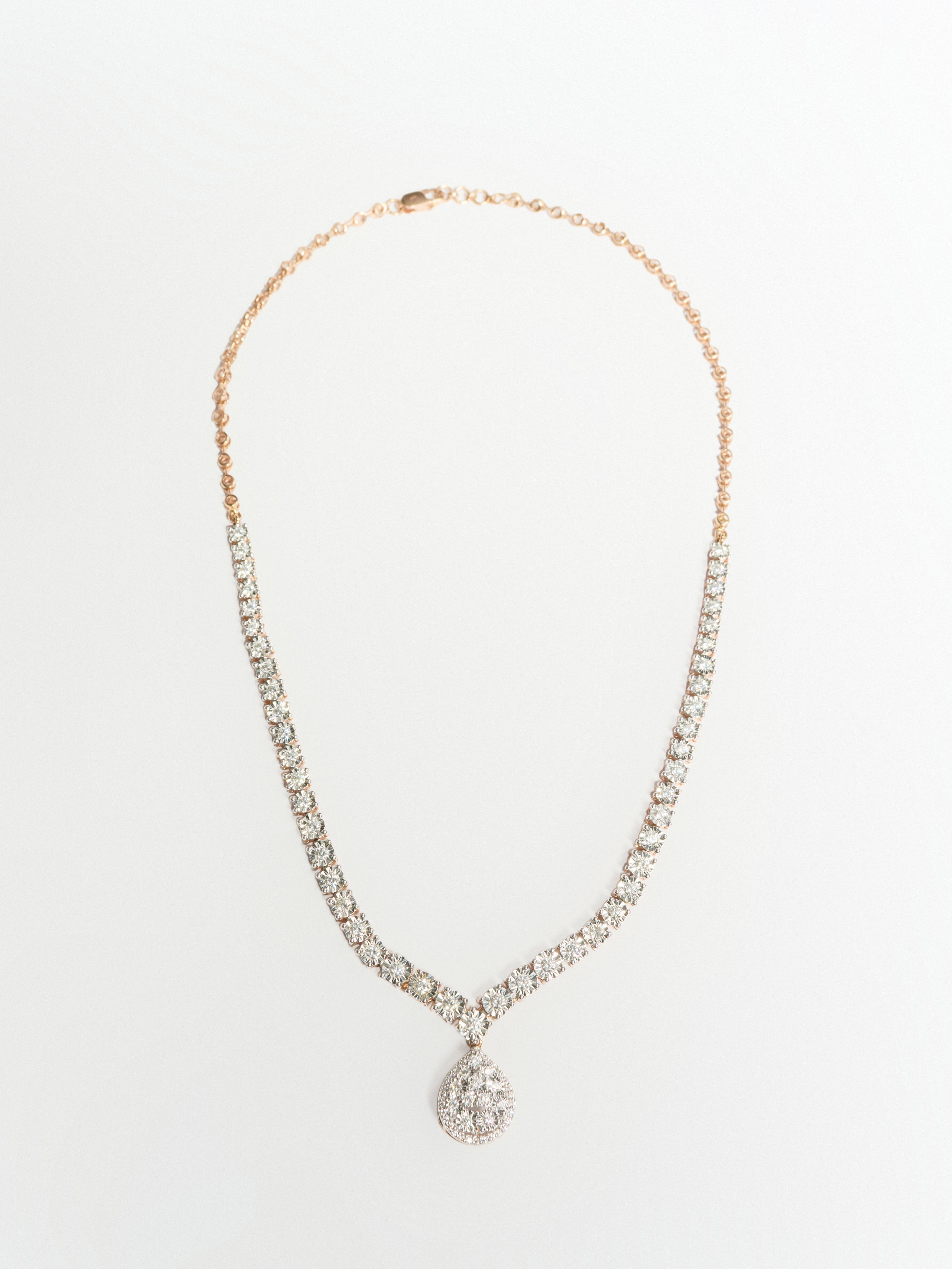 The Dewfall Leaf Necklace blends natural elegance with celestial charm. A graceful line of diamond-set leaves frames the neckline, leading to a radiant pear-shaped cluster that glimmers like a drop of morning dew. Delicate yet striking, this piece captures light with every movement, offering timeless sophistication. A signature creation from the House of Astral Symmetry, crafted for moments of pure brilliance.
